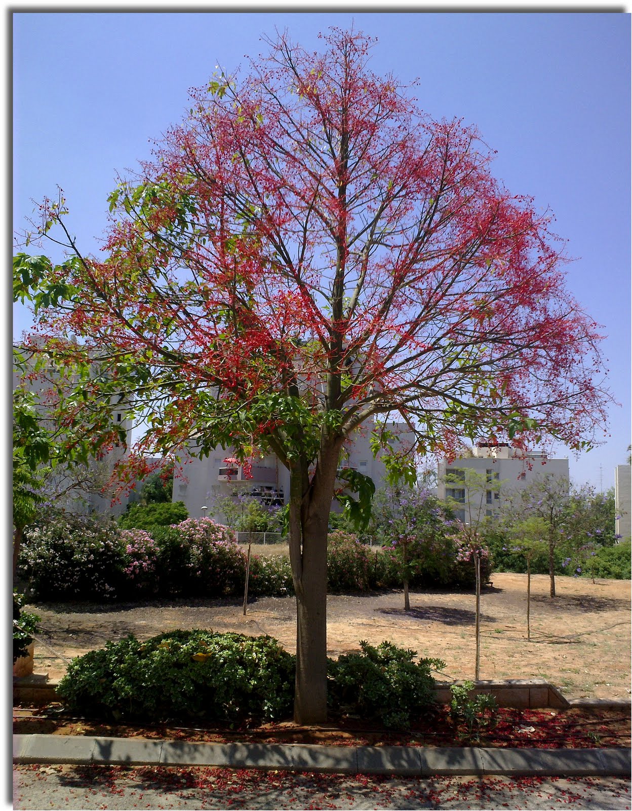 בחודשי האביב והקיץ הוא משיר את עליו הירוקים ומתמלא בפרחים אדומים,