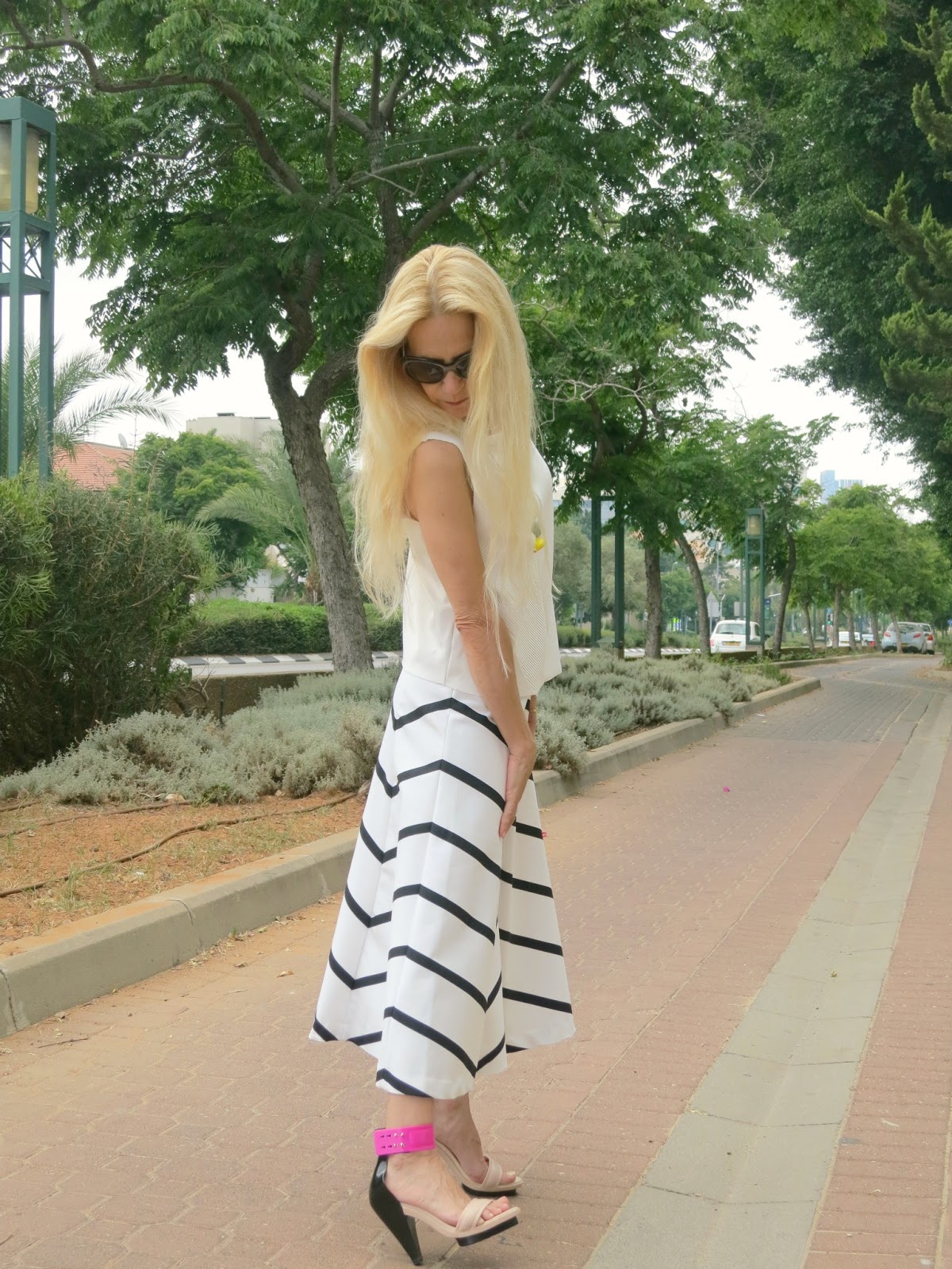 חצאית: זארה, חולצה: מנגו, סנדלים: ניין ווסט, משקפי שמש: סוניה ריקל